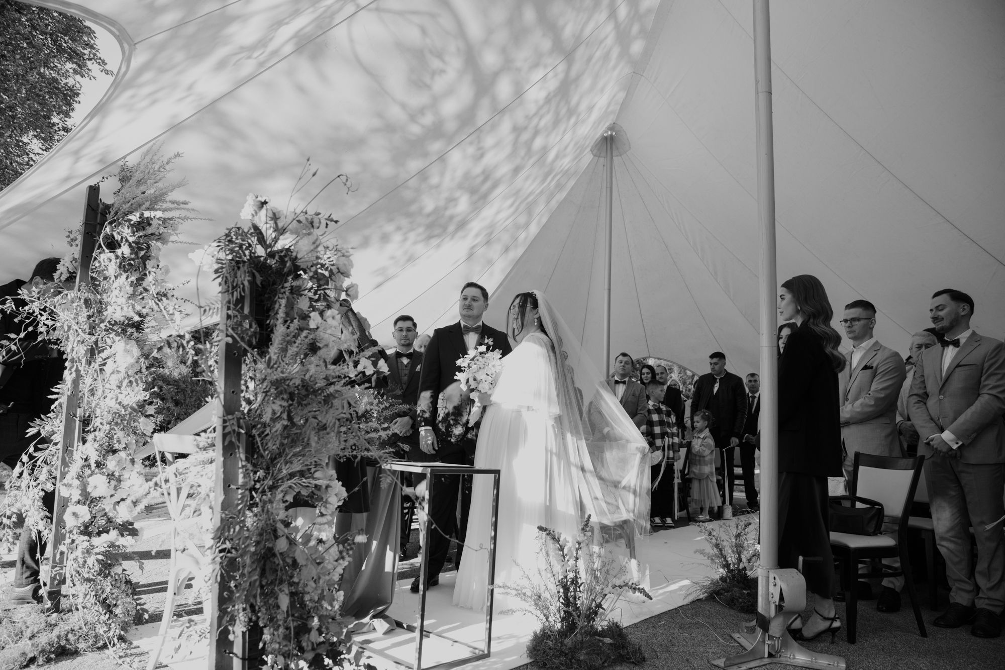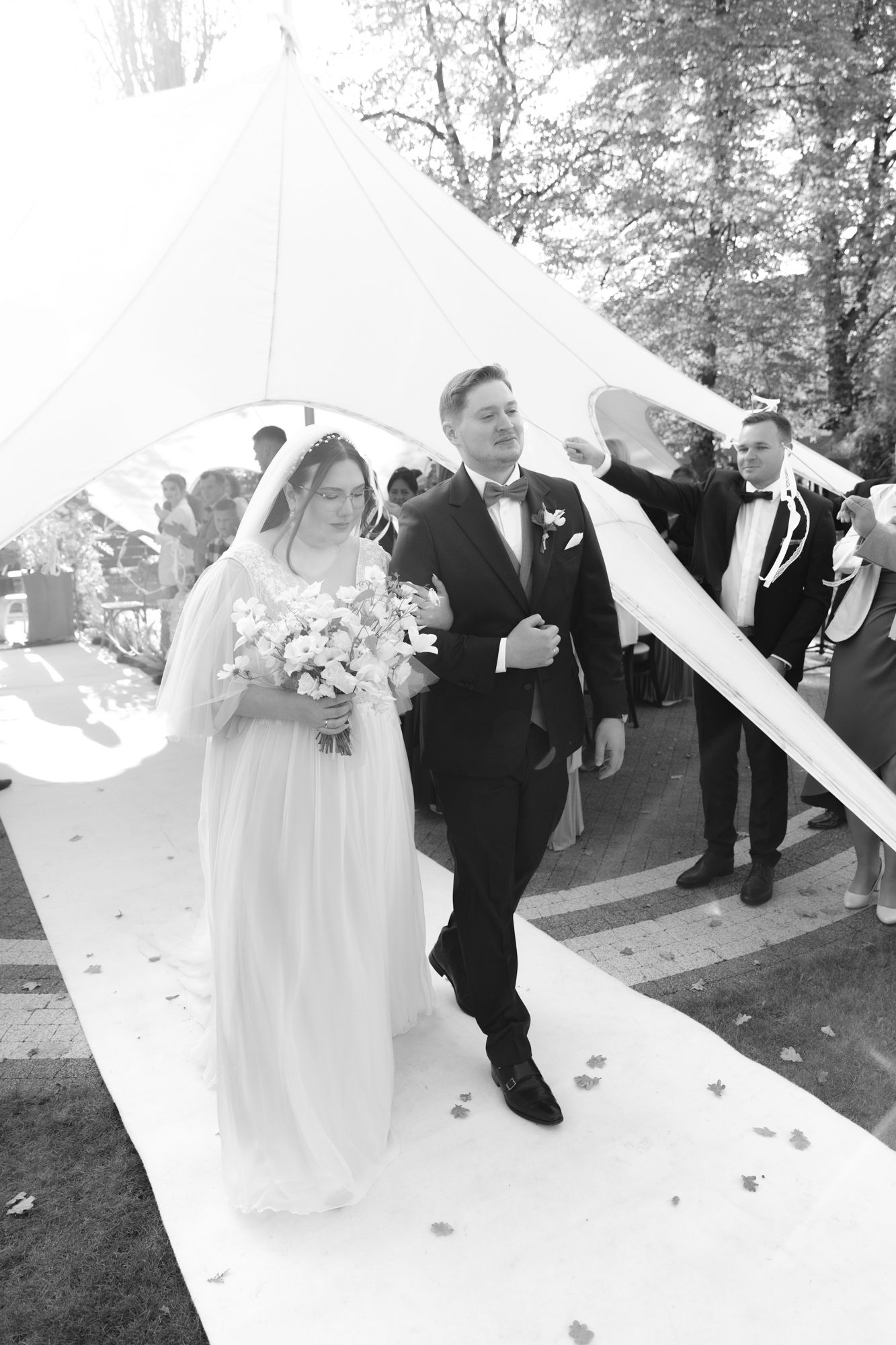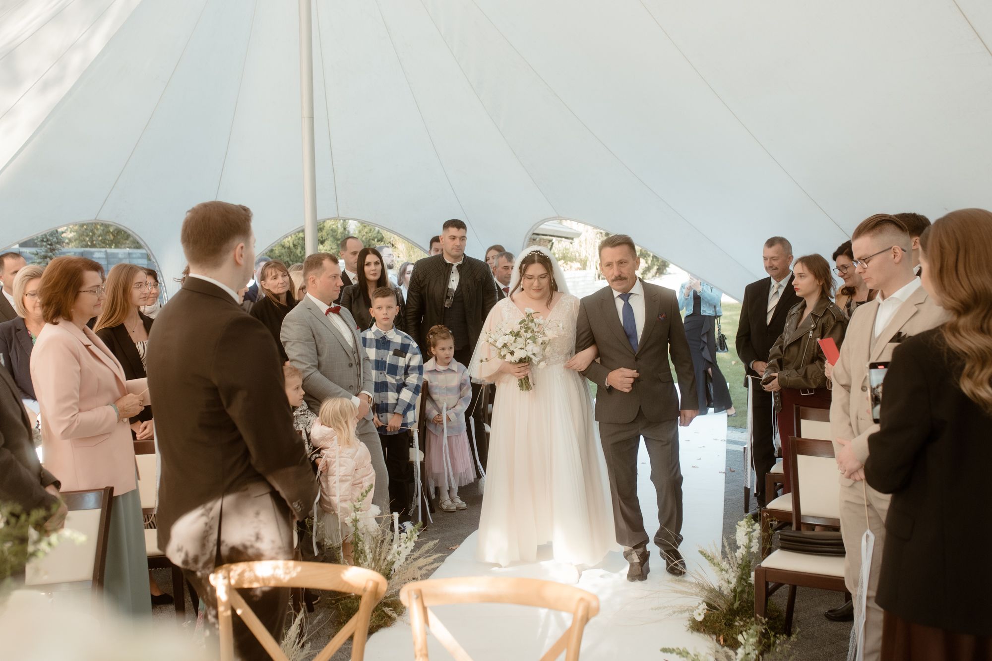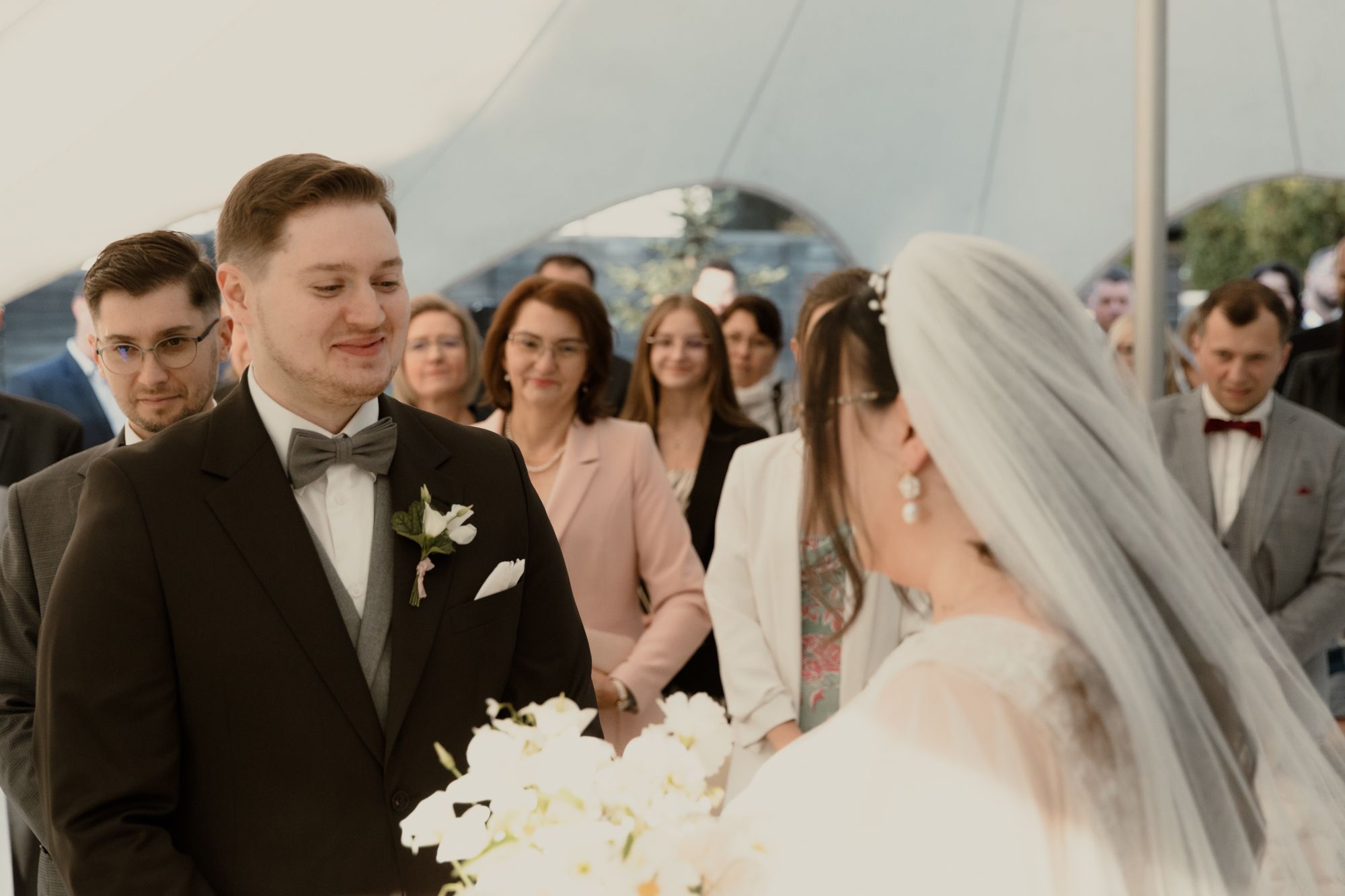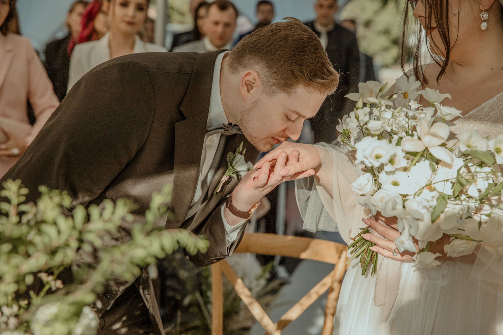 Justyna i Rafał uwielbiają styl vintage, co idealnie odzwierciedlało dekoracje i ich stroje – pełne klasy, subtelności i charakteru. Rafał na początku był lekko spięty, widać było, że przeżywa każdą chwilę, ale szybko odnalazł spokój przy swojej ukochanej. Justyna, choć bardzo przejęta, z wdziękiem radziła sobie z każdym wyzwaniem tego dnia. Razem tworzyli duet pełen wsparcia i uważności – ich spojrzenia mówiły więcej niż tysiąc słów. Byli dla siebie nie tylko miłością, ale i oparciem, i to właśnie te chwile wypełniły ich dzień magią.